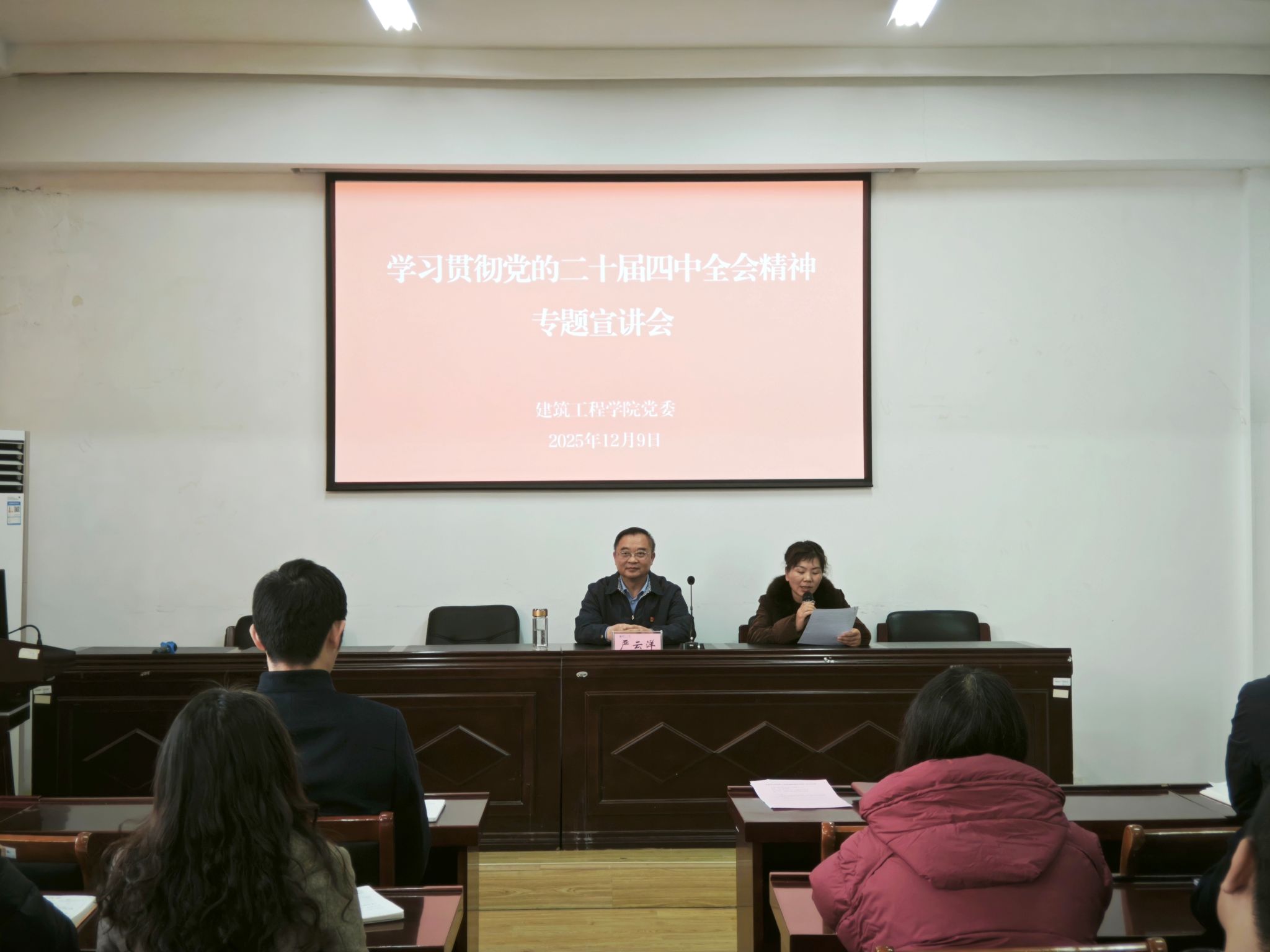 12月9日下午,校党委常委、副校长严云洋到建筑工程学院宣讲党的二十届四中全会精神。学院党委书记夏雪芹主持,学院全体教职工及学生代表参加学习。
