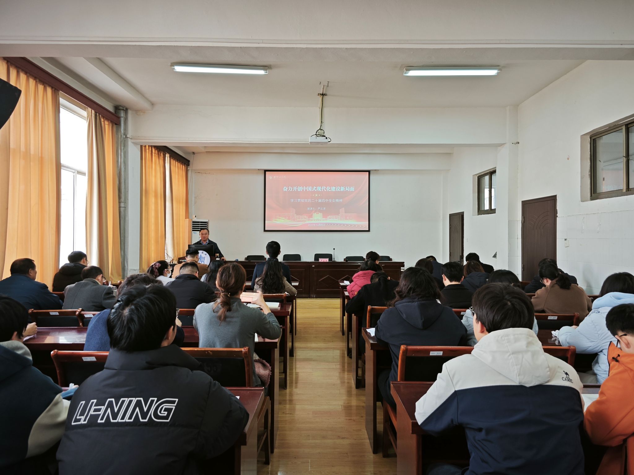 严云洋以《奋力开创中国式现代化建设新局面》为题,围绕“十四五”时期我国经济社会发展取得的重大成就、“十五五”的发展环境、行动纲领,以及立足岗位服务高水平大学建设等方面,对党的二十届四中全会精神进行了系统深入的阐释。