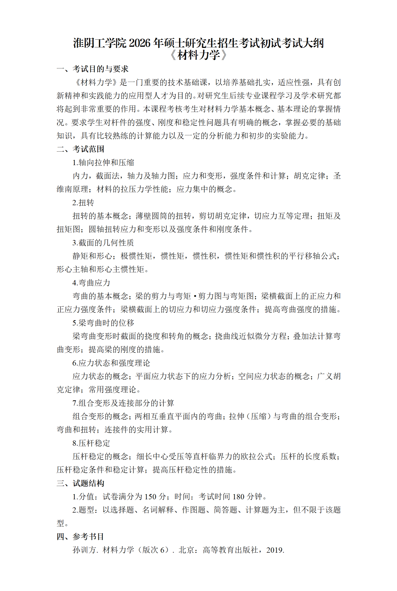 淮阴工学院2026年硕士研究生招生考试初试考试大纲《材料力学》