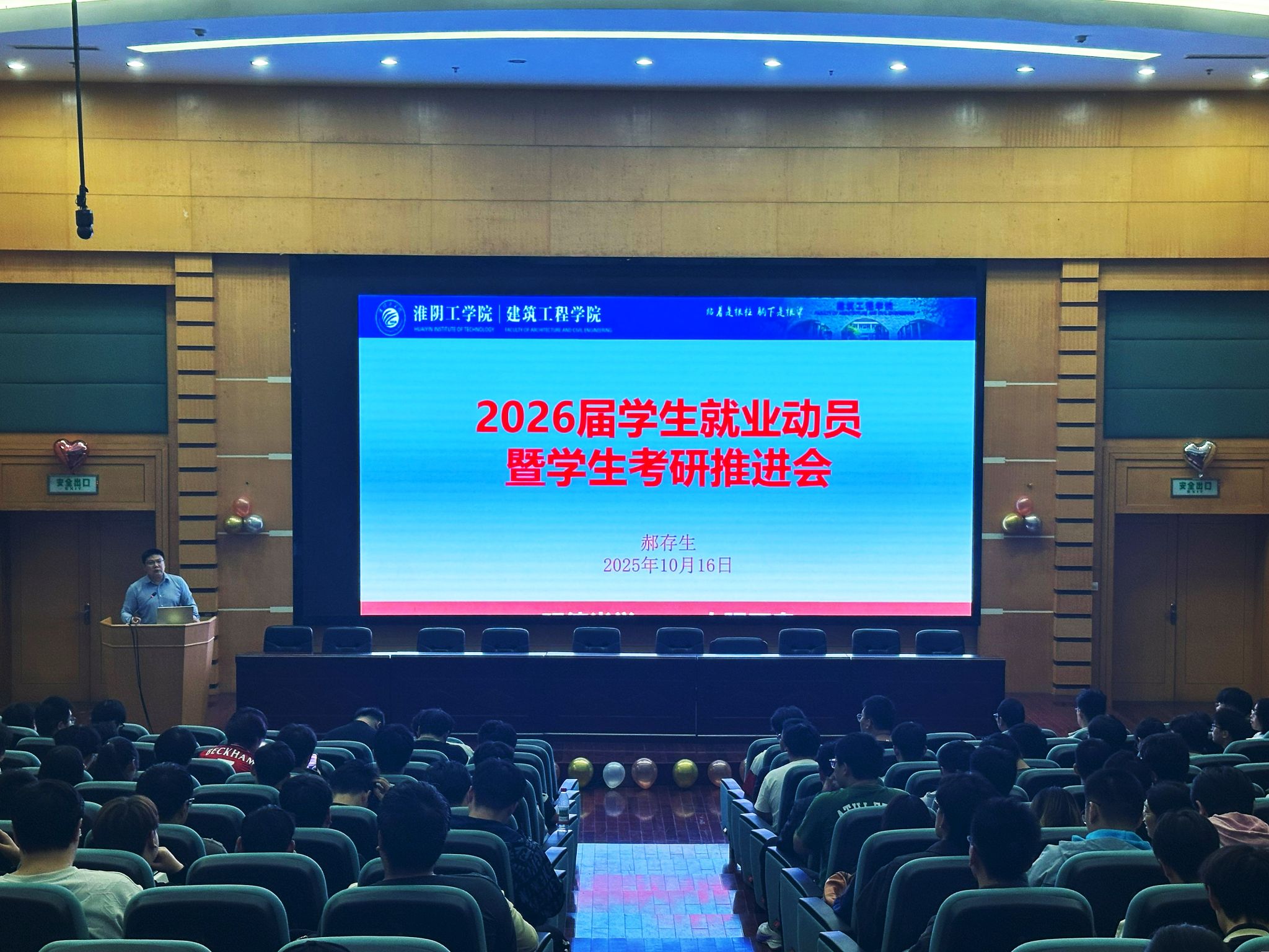 10月16日晚,建筑工程学院在主楼报告厅举行2026届学生就业动员暨考研推进会。学院党委副书记、副院长郝存生主持会议,院长助理张鹏、26届毕业生参加会议。