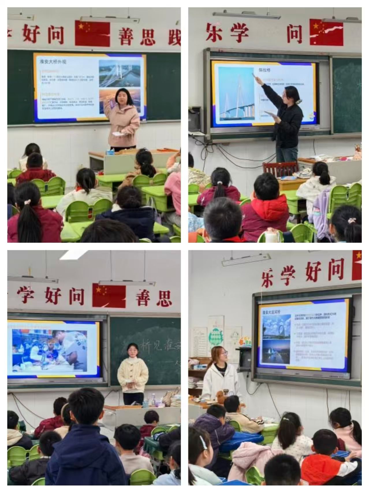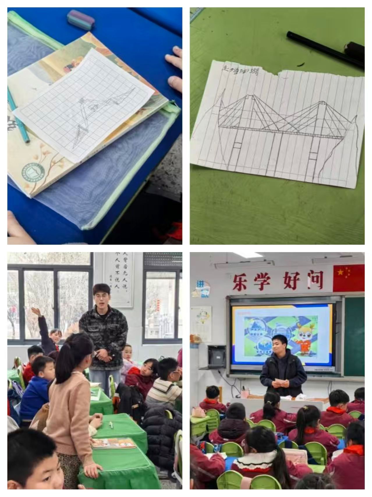 “同学们,你们知道世界上最古老的石拱桥在哪里吗?“活动现场,实践队成员化身“桥梁讲解员”,通过精美的PPT演示,带领孩子们穿越时空,从云南怒江的藤索桥、黄河上的浮桥,到浙江绍兴的石梁桥,再到今天的港珠澳大桥,生动讲述了桥梁从古至今的演变历程。